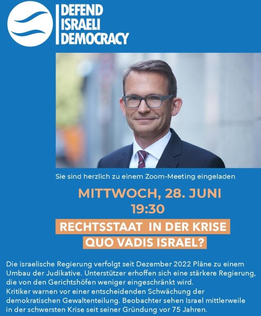 Am Mittwoch, den 28.6.23 lädt die DID zu einer gemeinsamen Zoom-Veranstaltung ein, in der der 1. DIJV-Vorsitzende Elmar Esser der Frage nachgeht „Rechtsstaat in der Krise – Quo vadis Israel?“.