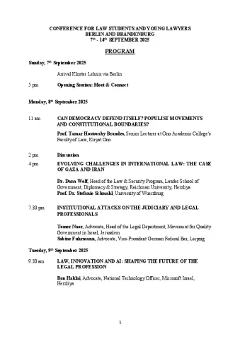 Das Programm für die Jugendtagung der DIJV/IDJV liegt jetzt vor - vom 7. bis 14. September findet die Tagung in Brandenburg und Berlin statt. Auf dem Programm stehen u.a. folgende Themen: völkerrechtliche Aspekte des aktuellen Nahost-Konflikts, Sicherung rechtlicher Strukturen bei Angriffen auf die Demokratie oder die Bedeutung von KI im rechtlichen Kontext, sowie der Besuch der Gedenkstätte Sachsenhausen bei Oranienburg und des Holocaust Mahnmals in Berlin und eine Führung durch das Haus der Wannseekonferenz.